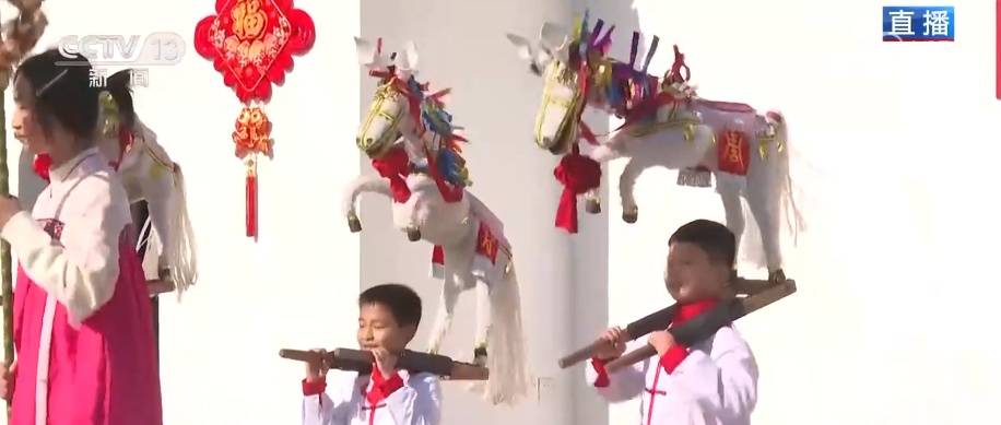 逛得盡興,更有好戲看!市集舞臺區的非遺民俗表演,表演者都是小朋友。首先登場的是背馬表演,它是國家級非遺“河上龍燈勝會”的重要組成部分。孩子們身上背著裝飾精美的“竹馬”,踏著鼓點昂首前行,它們也是龍燈隊伍的“開路先鋒”,瞬間把熱鬧氛圍給拉滿。